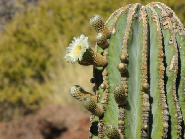 The photo is of a cardon cactus blooming near Salinas Bay, on Isla Carmen, Baja California Sud, Mexico in early April 2017.
