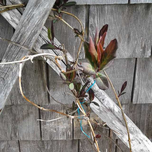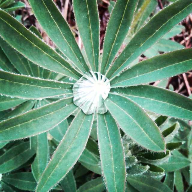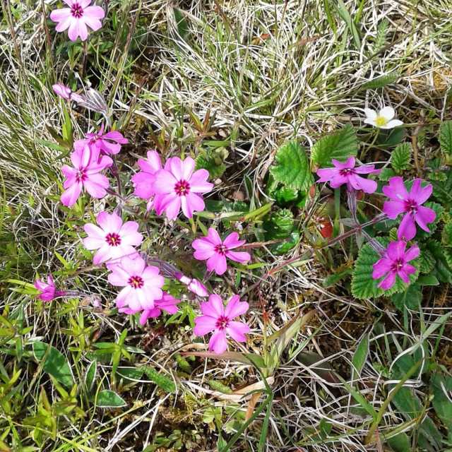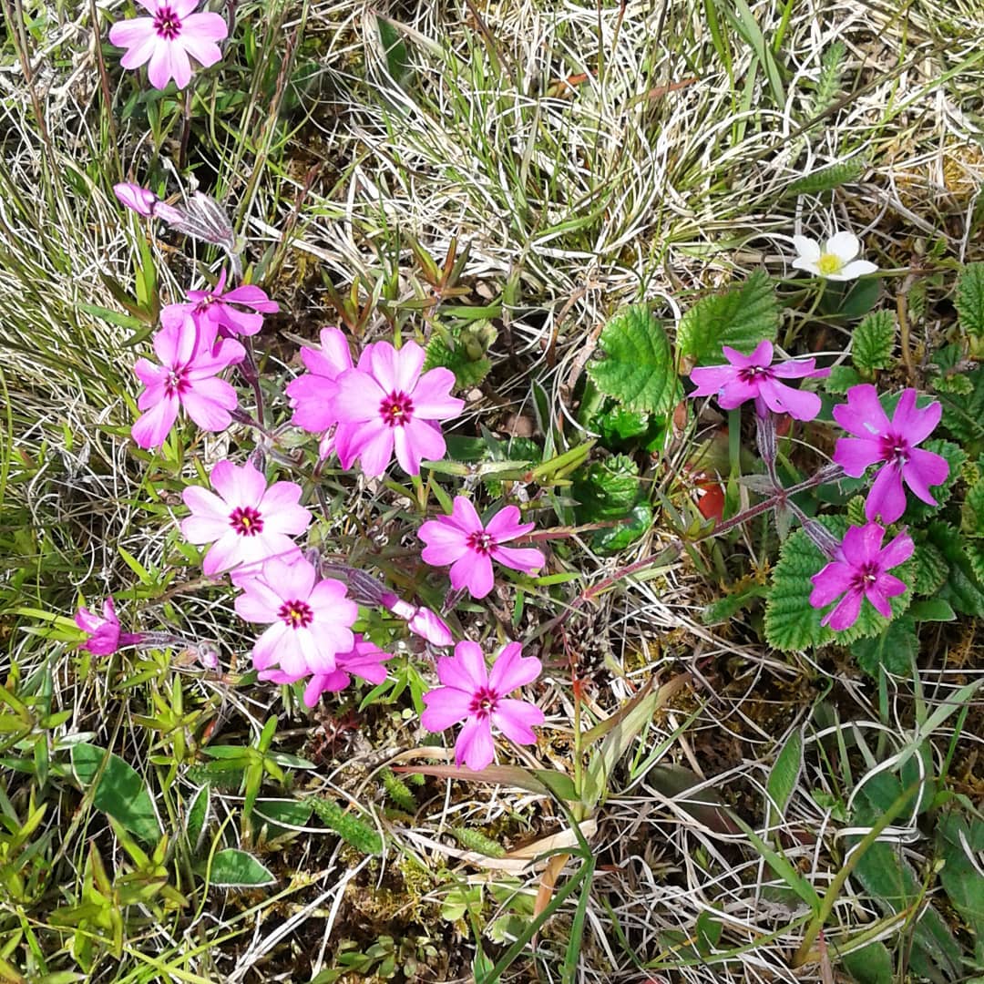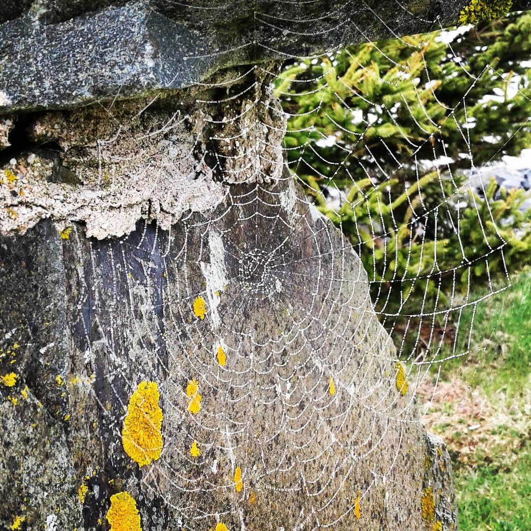 Photos are of daffodils in the grass; clematis climbing the garage; phlox, strawberries and moss escaping garden confines; rhubarb leafing out; spider web and maritime sunburst lichen (Xanthoria parietina) on greywacke inukshuk; raindrop in a lupin leaf; peony shoots; Marike and Enya the fog on a Quoddy cobble beach. All are recent images from my Instagram feed: (@karinmariecope).