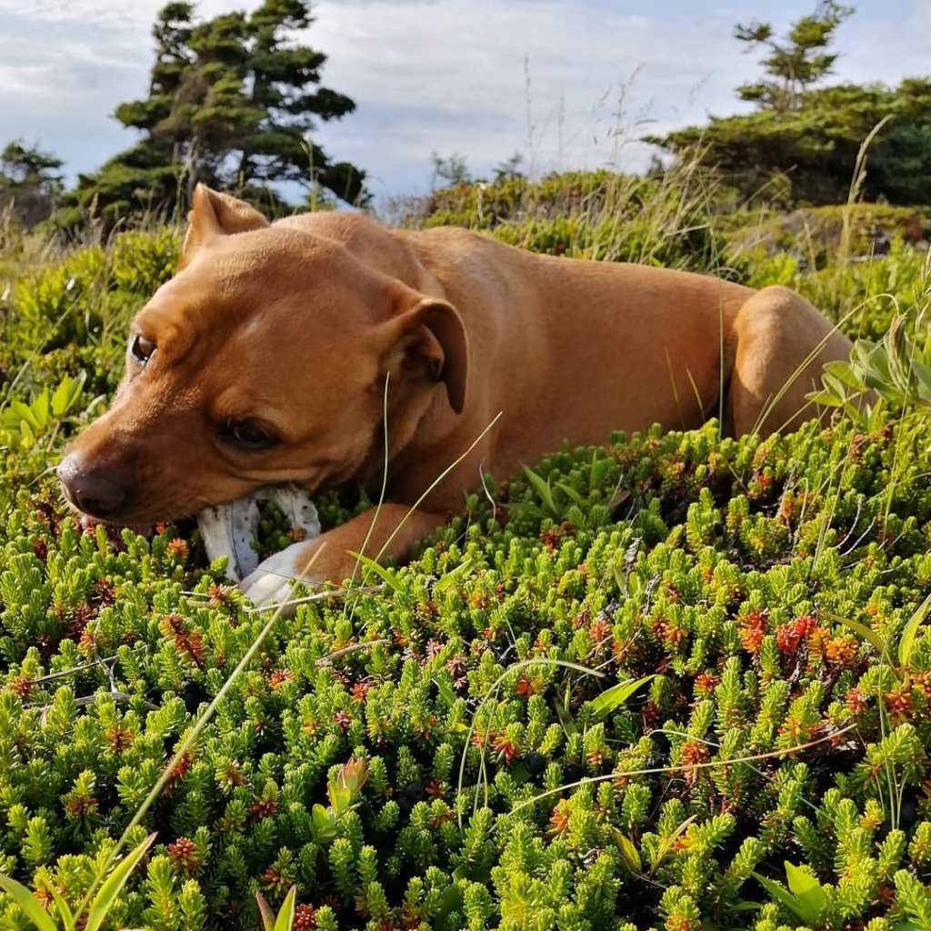 After our walk we visited a bit with some elderly neighbours. They were preparing for surgery and going through their papers looking for the life insurance policy–“death insurance” they called it. Meanwhile the dog gnawed on bones drawn out of the splay of a seal carcass: I called the remains of the skeleton her “bone storage system” since she comes back again and again.