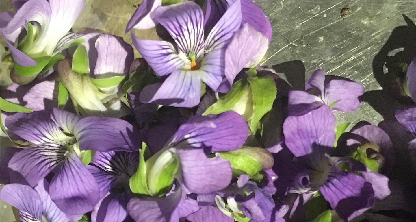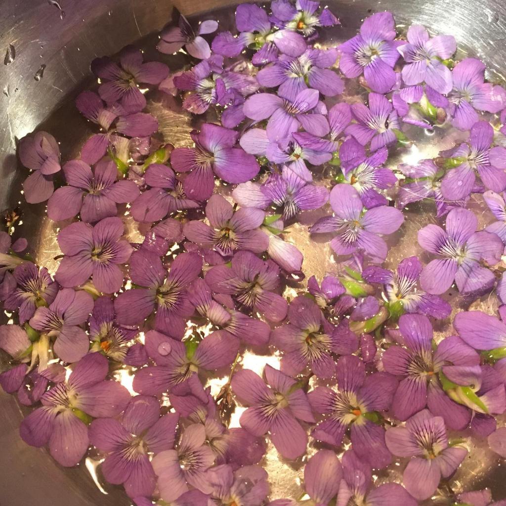 We gathered rhubarb from our neighbours’ patch and close by, in a dell, I found a broad scattering of violets, the last of the season. I plucked them and dropped them into my hat; I wanted to try to make violet flower ink.