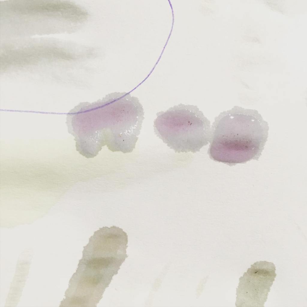 When I boiled the flowers, the violets released their colour into the water. At first the colour broke from the petals in flecks and patches of blue, then dissolved. Soon the violet petals were leached white and the water a luscious rosy colour. I was missing a key thickener–gum arabic–so on the advice of various friends tried honey and maple syrup instead. I dropped purple spatters on paper–the syrup turned the wet ink a viscous iron colour–but everything dried to pale shades of green of greater or lesser stickiness.