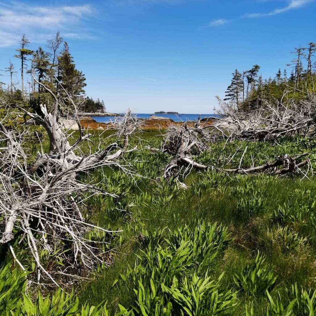 We walked at Sober Island today. The sea rolled in, crashing noisily against the shore and the wind was cold but bracing. Every day a little more of the path to the headland crumbles into the sea and the juniper swathed scrub is red with salt spray. Many of the remaining grizzled black spruce–more bush than tree-turn slowly to skeletons: twisted whitened forms scoured of bark and needles, branches reaching back landward as if shaken by and fleeing a permanent storm.