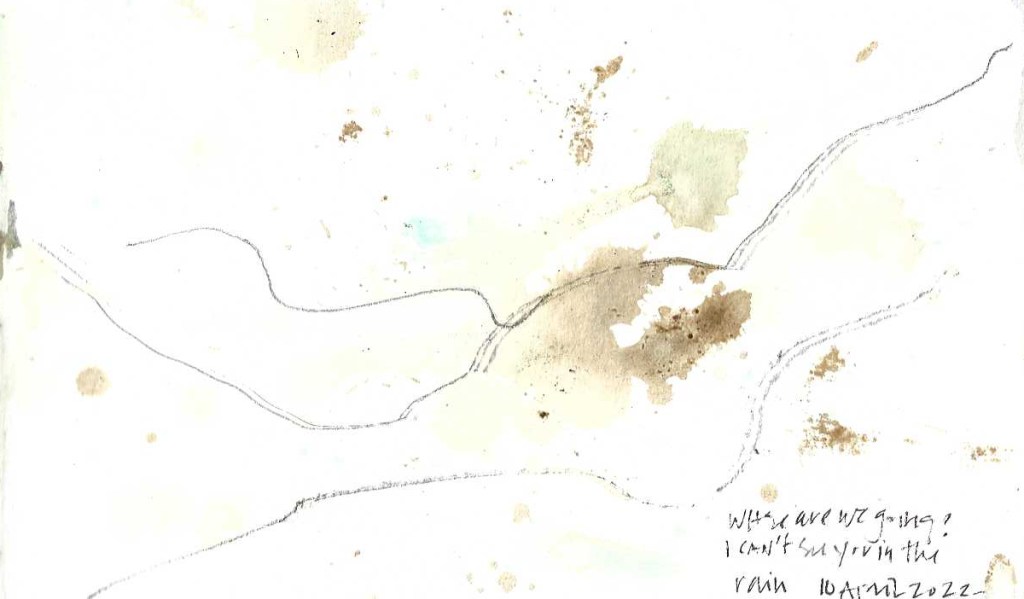 Images are from 1) a sketch entitled “today we wake to wind and snow” made by pouring inks and using broken ink sticks as rough drawing implements, 2) another #poursketch called “where are we going? I can’t see you in the rain” and 3) a photograph of sunrise taken through a slick of condensation.