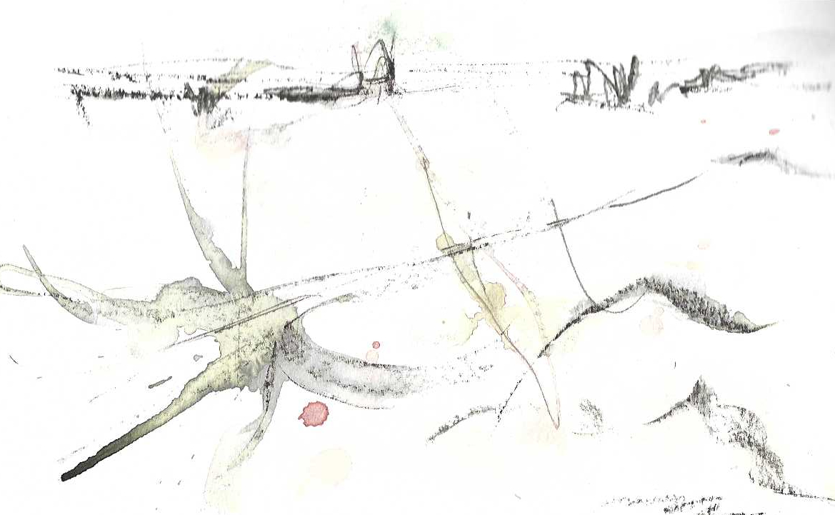 Images are from 1) a sketch entitled “today we wake to wind and snow” made by pouring inks and using broken ink sticks as rough drawing implements, 2) another #poursketch called “where are we going? I can’t see you in the rain” and 3) a photograph of sunrise taken through a slick of condensation.