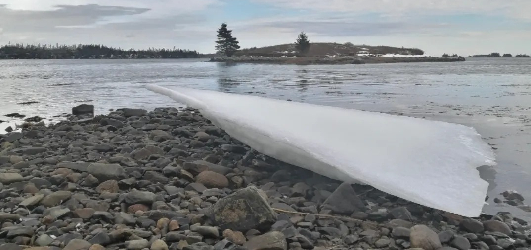 We wake to a frozen sea, a pale sun seeping through grey clouds. The rising tide breaks up a brittle skim of ice and carries drift pans, like logs, into shore. For a few moments, the icy sea turns blue with refracted light; the clouds part, and weak shadows lean across the day.